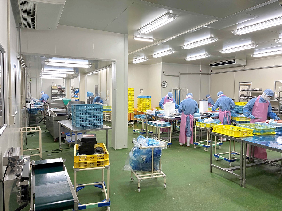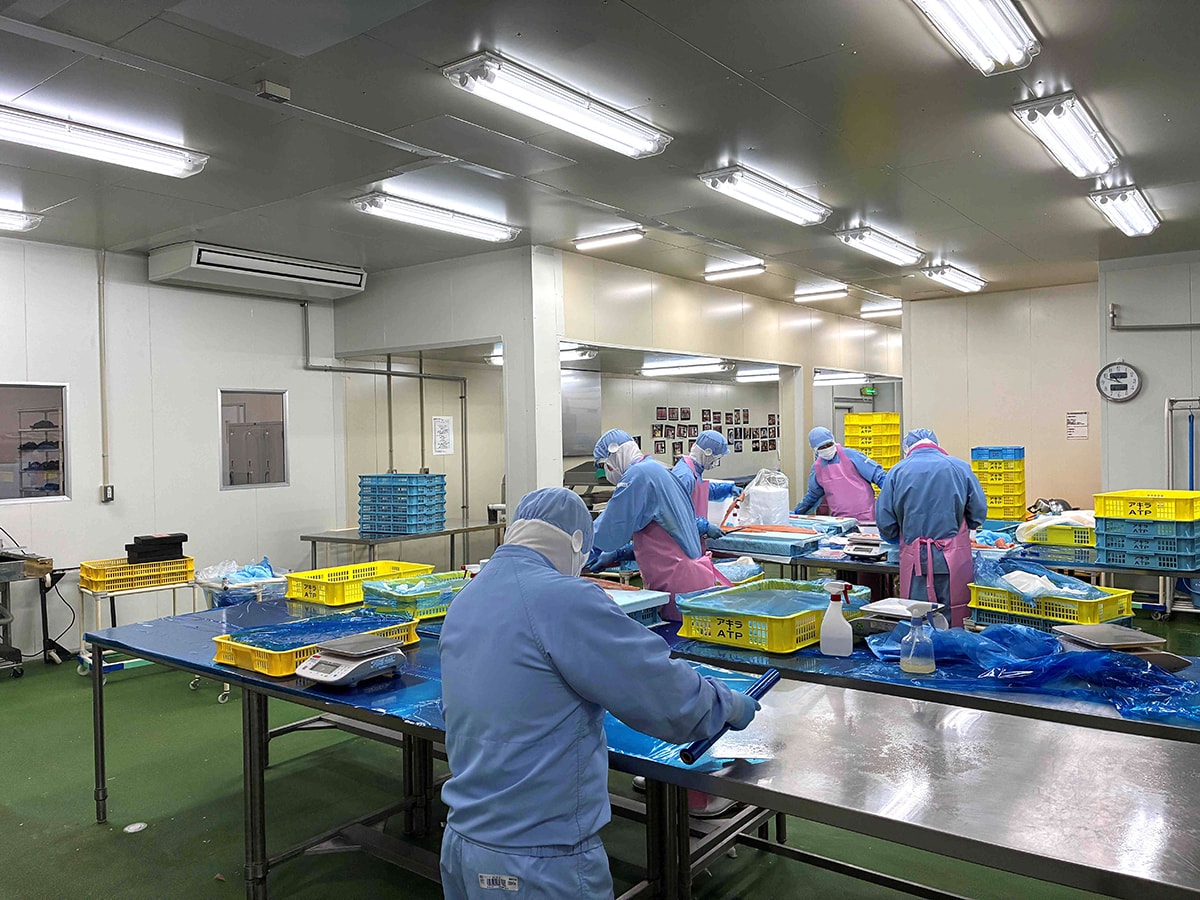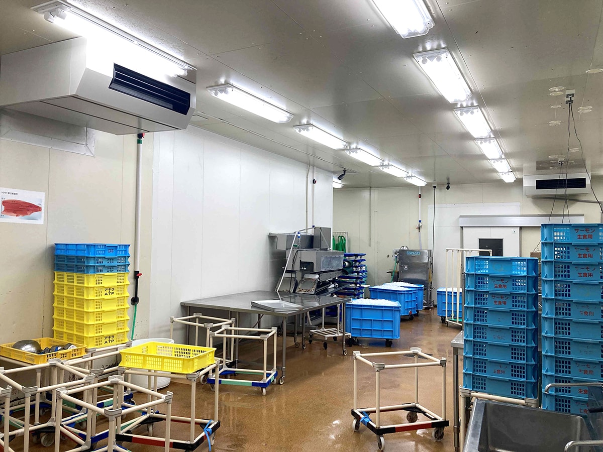 製品の鮮度保持の為、夏場の水温上昇対策として冷水チラー設備を導入、ウェット作業場の結露、カビ対策として、天吊型除湿機を導入致しました。